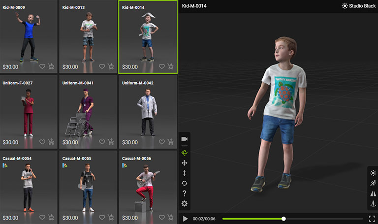 帶有骨架的 CC3+ 拓撲支援全身形變、服裝和皮膚紋理。可擴展用於高解析度 3D 演員和快速群體模擬。