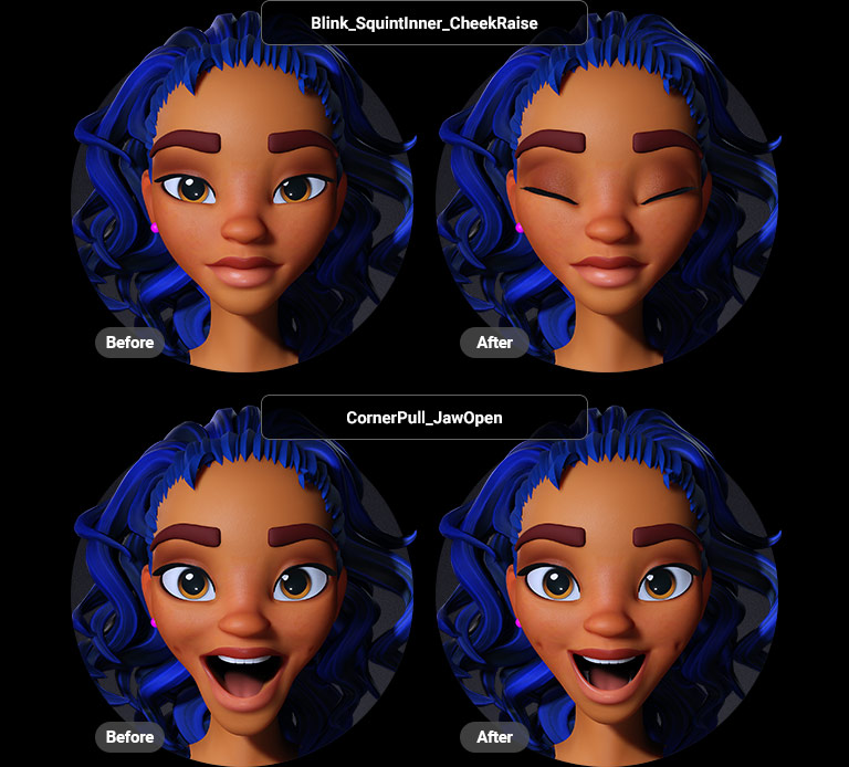 廣泛的唇部控制功能可實現高度精準的說話動畫,無論是手動製作還是由臉部捕捉驅動,都能緊密模仿原始表演者。