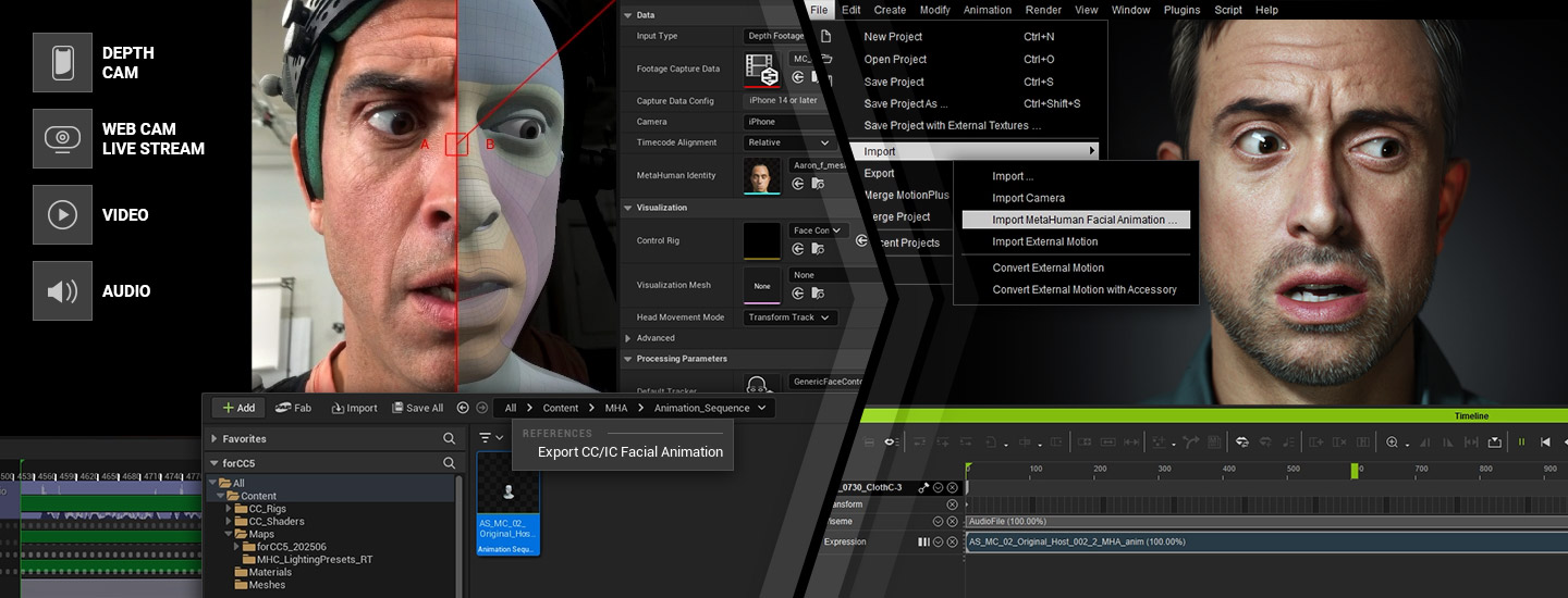 CC5 HD 人物與 iClone Motion LIVE for iPhone 和 AccuFACE 視訊素材追蹤功能無縫整合,同時完全相容於 MetaHuman Animator 臉部動作捕捉工作流程。