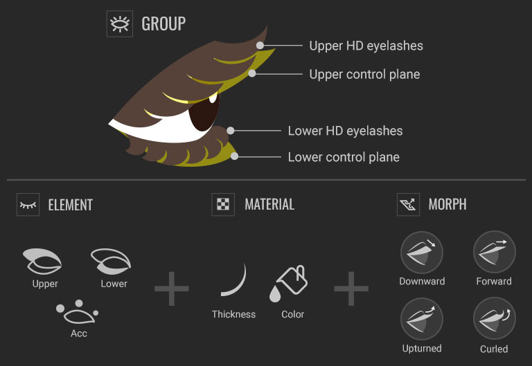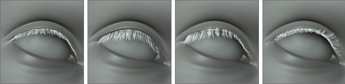 一整套睫毛形變功能可讓您精確塑造睫毛。無論是直的、下垂的、上翹的、捲曲的,還是眼角長度不同的,任何風格都可能實現。
