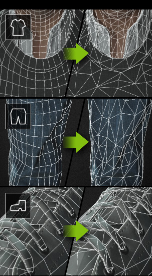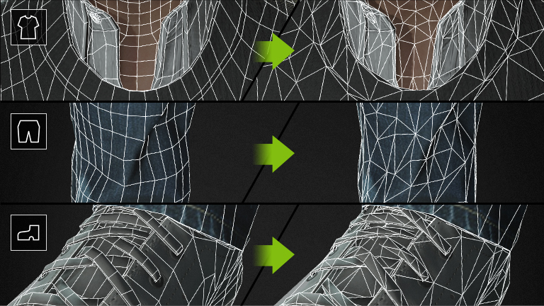 在 ActorBUILD 轉換過程中,CC 人物骨架會被替換為來自 遊戲基礎模型 的 10k 拓撲,並保留 101 根骨骼以用於 Omniverse 和 Unreal Engine 等 3D 平台中的全身、基於 LOD 的動畫。為了進一步最佳化群體模擬,設計師需要手動降低服裝解析度,用網格頭髮替換髮片,並應用紋理圖集以整合 PBR 材質。一旦轉換過程完成,一個 ActorBUILD 人物將從一個完全著裝的 CC 人物中提取出來,檔案大小減少十倍。