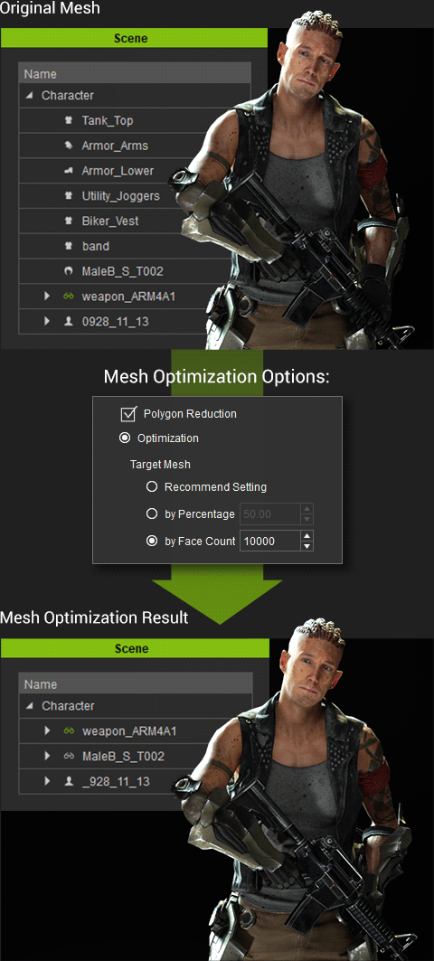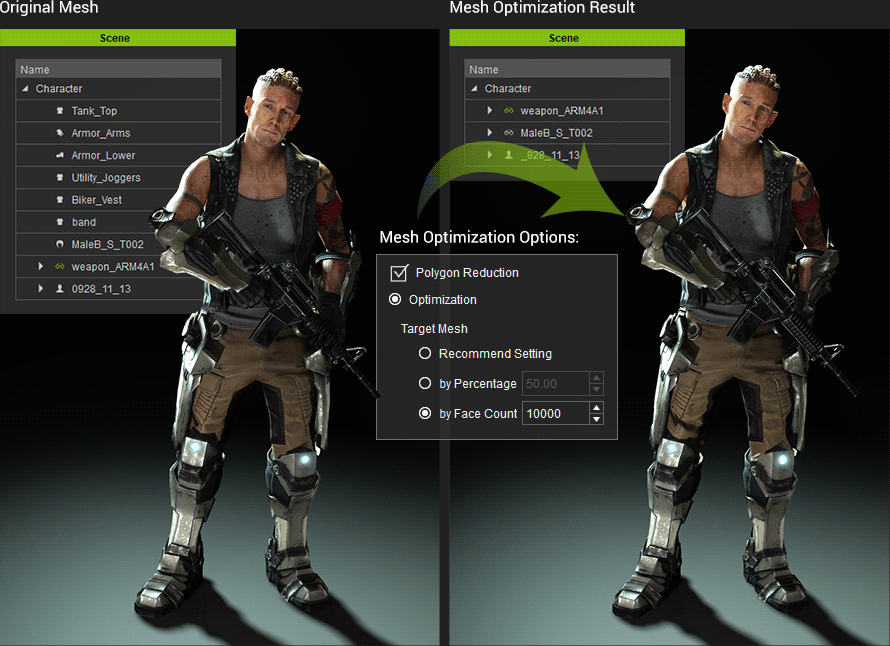 用於單個網格最佳化,減少多邊形數量同時保持網格結構和材質數量。