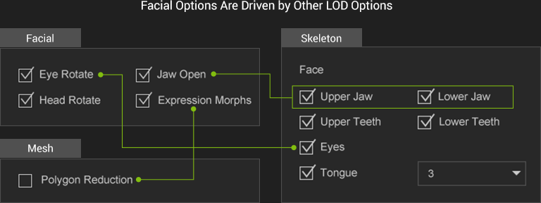 當人物離鏡頭較遠時,臉部動畫數據,包括數百個表情形變和唇形,變得多餘。臉部精簡面板允許設計師選擇性地移除臉部形變、牙齒和舌頭、臉部骨骼,以獲得最佳的即時效能。