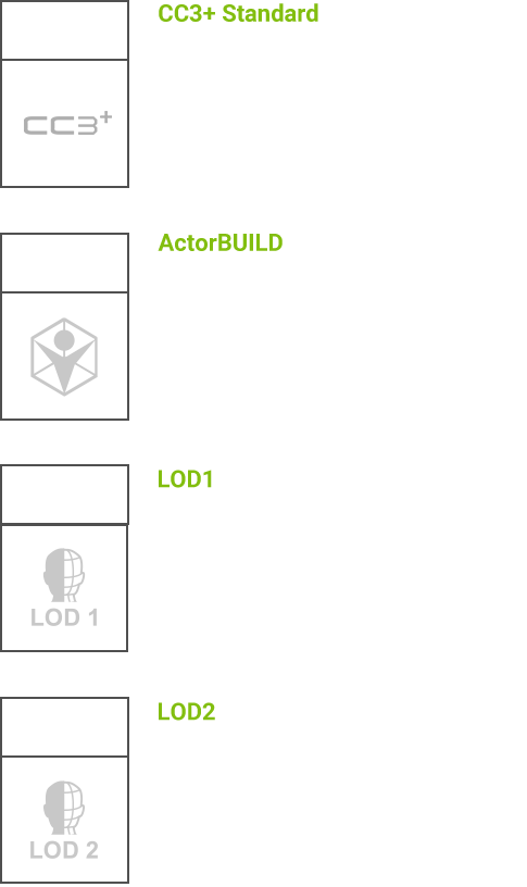 | 人物等級 | 細分匯出 | CC Avatar(CC3+) | ActorBUILD | LOD 1 | LOD 2 |