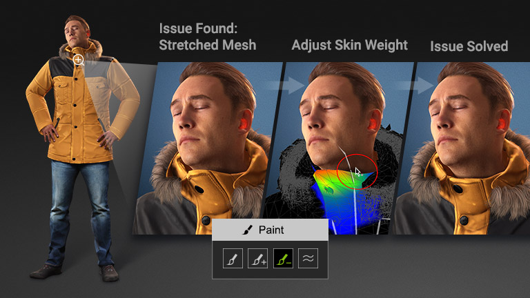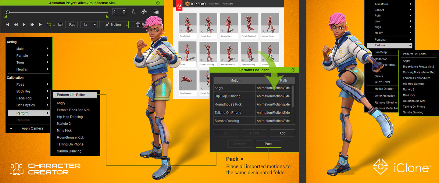 除了在 CC 中建立 3D 人物模型外,透過動畫播放器,設計師可以讓他們的人物生動地呈現自然臉部和身體動作,並能以 360 度轉盤良好地展示。自由地結合身體動畫與臉部動作,或將動畫設定回擺姿。在載入人物或套用動畫檔案時自動播放動畫。 手冊