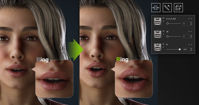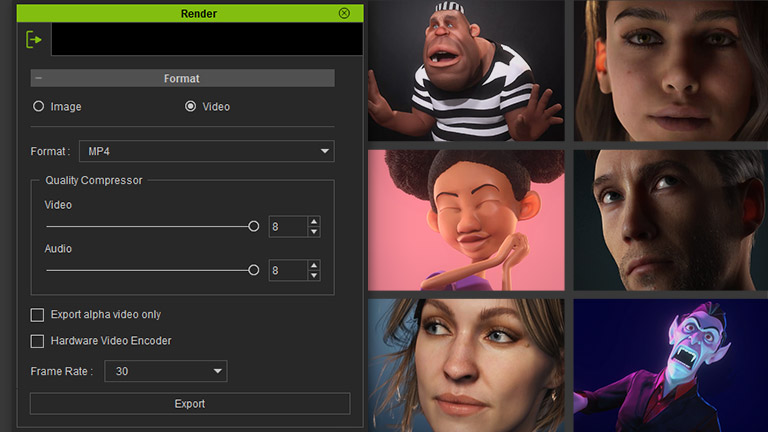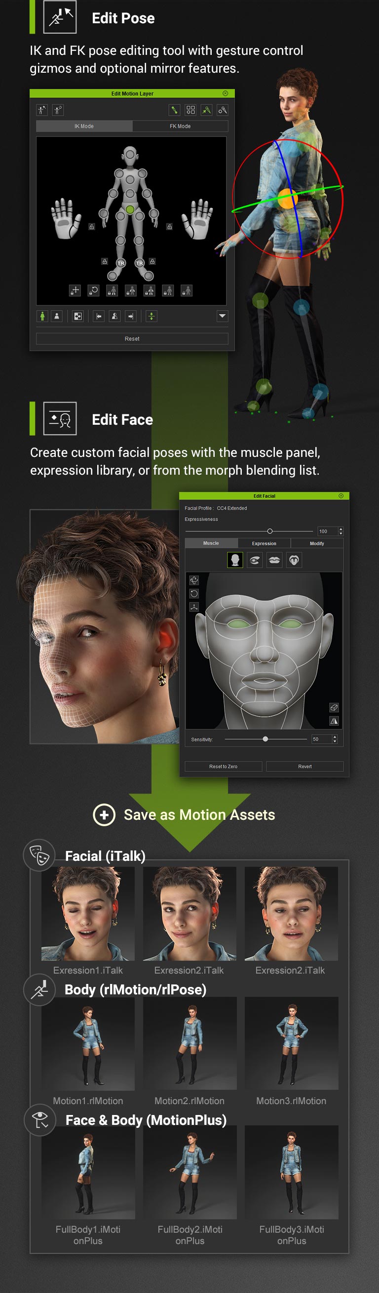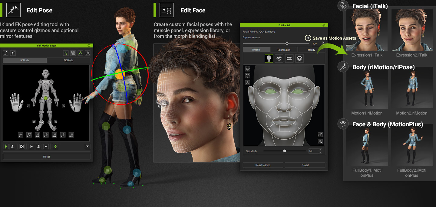 除了從動畫檔案中擷取選定的姿勢外,使用者還可以輕鬆建立自訂的臉部和身體姿勢。將結果儲存到動作庫中,透過轉盤顯示,渲染為高解析度媒體,或匯出為 OBJ。