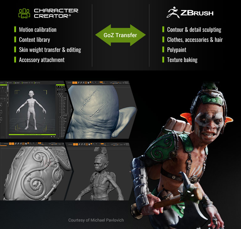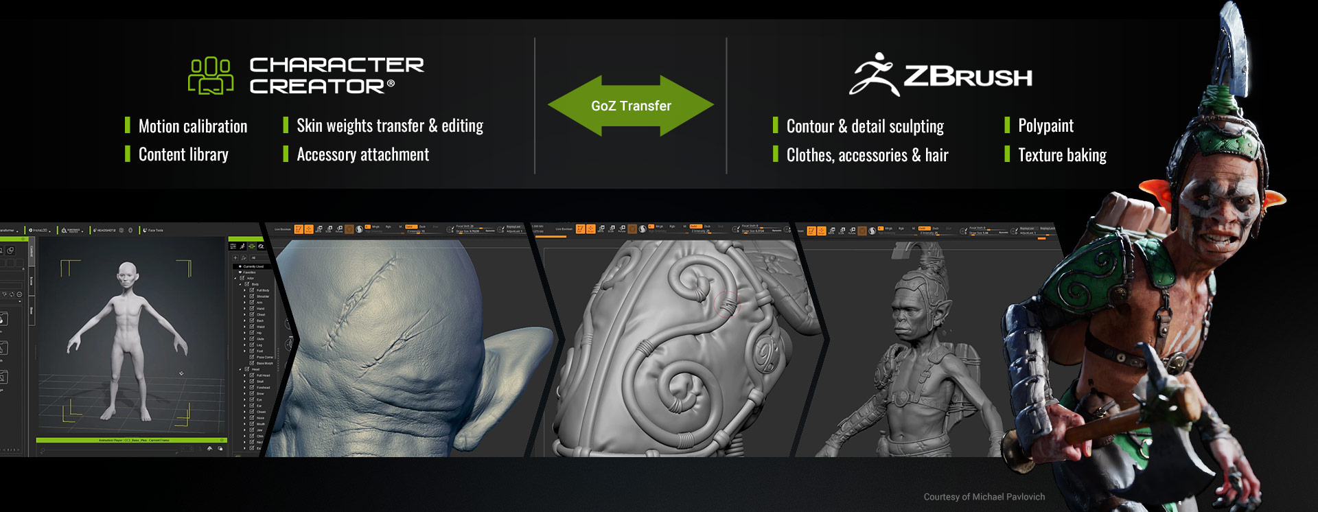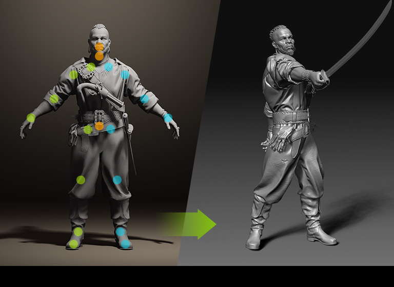 透過利用穩固的人物基礎和無縫的 GoZ 往返功能,藝術家可以快速將複雜的雕塑轉換為動畫人物。只需單擊一下,即可輕鬆將 ZBrush 資產(包括變形、紋理、服裝、髮型和配件)傳輸到 Character Creator。動畫成為一個動態的過程,利用多樣的動作庫、HumanIK 編輯或動作捕捉技術來呈現逼真、動感十足的渲染。
