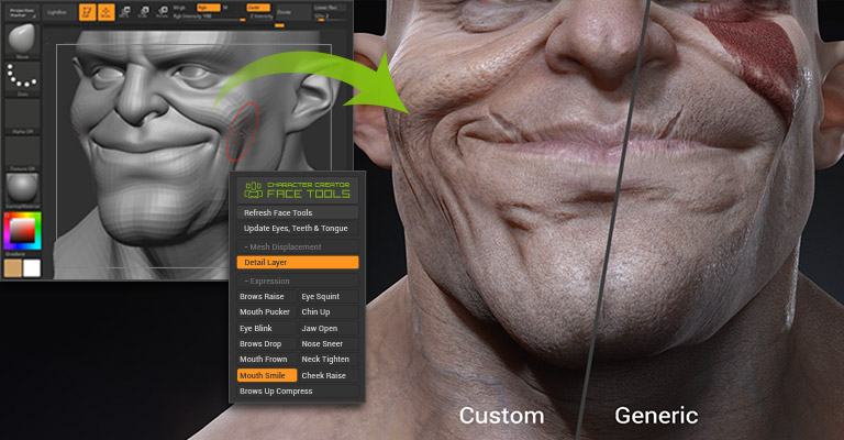 透過 Face Tools 掌握令人信服的表情和獨特的人物個性。輕鬆將 Character Creator 中的基礎表情傳輸到 ZBrush 進行客製化,並選擇性地更新表情以實現即時轉換。