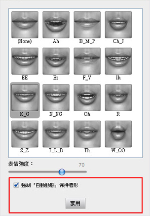 之前,若角色下顎受「自動動態」指引,嘴巴便會依據聲音強度張合,顯得不太自然。V7.2 新增唇形強制,讓嘴巴在發 EE, Ih, Ah, Oh 等音時張開,而在發 B_M_P, S_Z 等音時是閉合的。