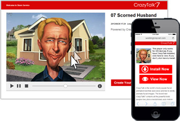 將專案發佈至社群網站或任何網頁後,使用者或訪客即可在 PC 或 Mac 上體驗與角色的有趣互動。若使用者透過 iPhone 觀看相同頁面,則會收到訊息提醒需先下載免費的 CrazyTalk iOS app,以進行觀看、互動與重製專案動畫。