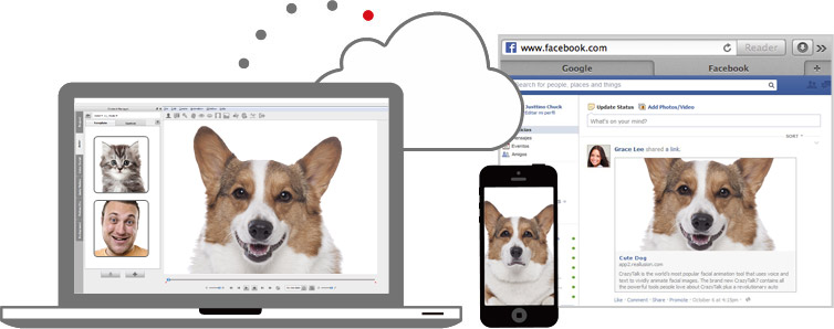 CrazyTalk7.3 讓您的角色動畫創作隨時可玩、隨處可見!不僅如同以往可輸出至 iOS 裝置,更可直接廣發到 Facebook, Twitter, Google+ 等流行的社群網站;利用程式碼還能將活潑生動的互動角色嵌進您的個人或公司網頁設計。此外,新一批精製的真人眼睛與牙齒,搭配可自訂的動作強度調整,替您的真人照片角色表演增添絕佳的自然擬真感。