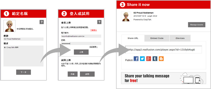 可替專案命名並加上敘述。已註冊的 CrazyTalk 使用者可選擇「會員上傳」,試用版使用者則可透過「試用上傳」體驗完整流程。上傳完成後即可分享專案至社群網站、各網頁或 iOS 裝置。