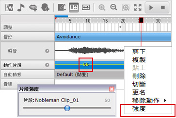 - 在動作片段軌上按滑鼠右鍵開出選單,點選「強度」後拖曳「片段強度」的滑桿。