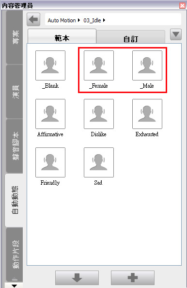 點擊「顯示內容管理員」按鈕切換至「內容管理員」/「自動動態」素材庫,或拖放所要的「閒置動態」至「輸出設定」面板任一處,便可替動畫專案新增閒置動態。