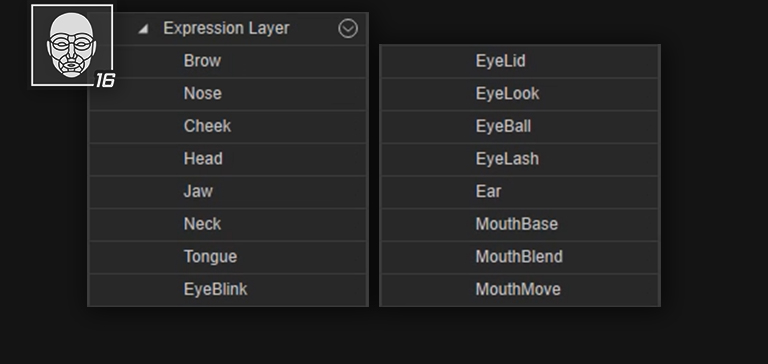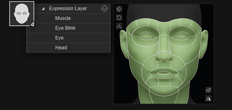 一旦透過唇形同步,臉部動捕或操控產生臉部表情之後,便可用「臉部關鍵格編輯器」微調五官細節。關鍵格會覆蓋及混和至現存表情並存於時間軸軌道中以利後續編輯。