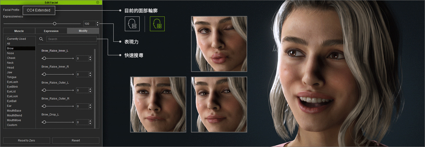 透過「形變滑桿」直接取用「60+ 標準」或「140+ 延伸」混合形狀。其中數個使用形變滑桿的特殊值給予表情細節完整控制;允許輸入外推強度值(+/-200);觀察「肌肉面板」及「表情範本」驅動哪些混合形狀。此外,關鍵字搜尋自訂目標形變及輸出至外部 3D 工具可實際看見混合形狀名稱與其數值。