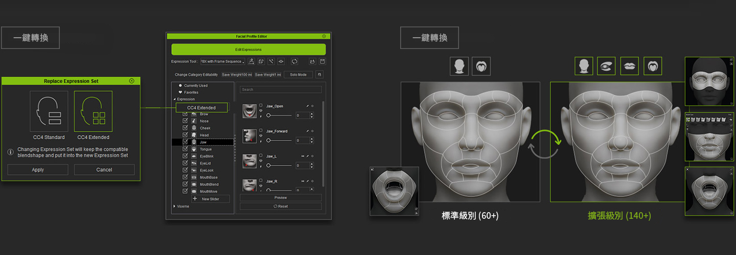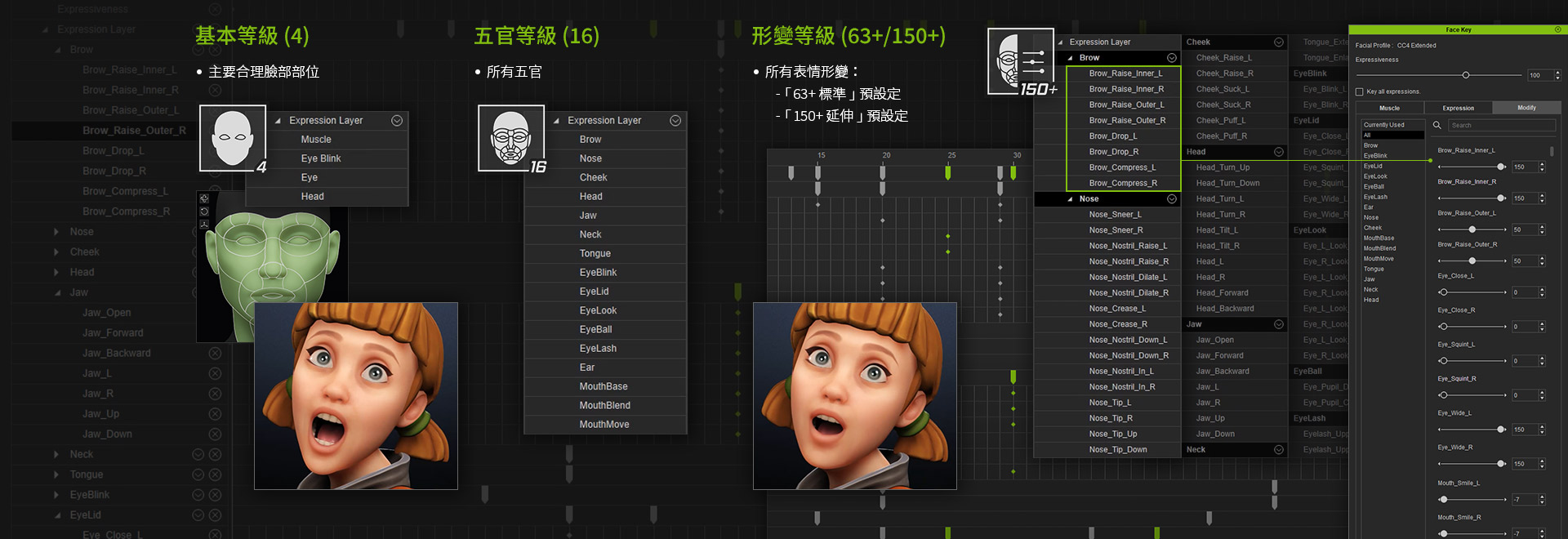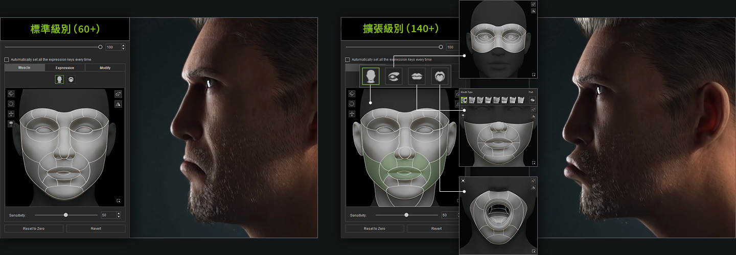 需要用 Character Creator 的可擴展表情系統特定輸出等級時,設計師可輕鬆從角色表情細節的 60 至 140 混合形狀中昇級或降級。
