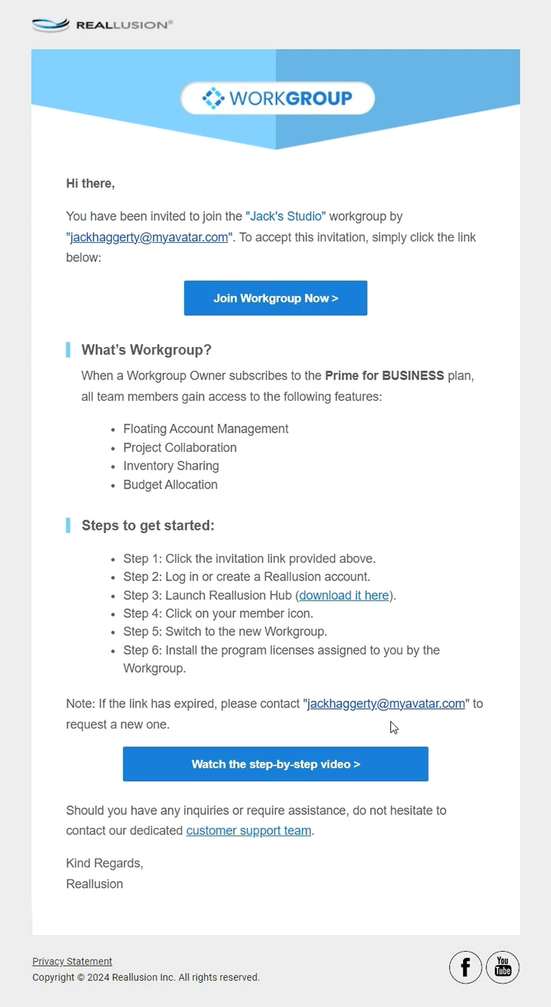 Users who are utilizing a license from an expired Workgroup will receive a notification about their removal from the Workgroup on Reallusion Hub. This notification will be sent irrespective of the time elapsed within the subsequent 2-month grace period.