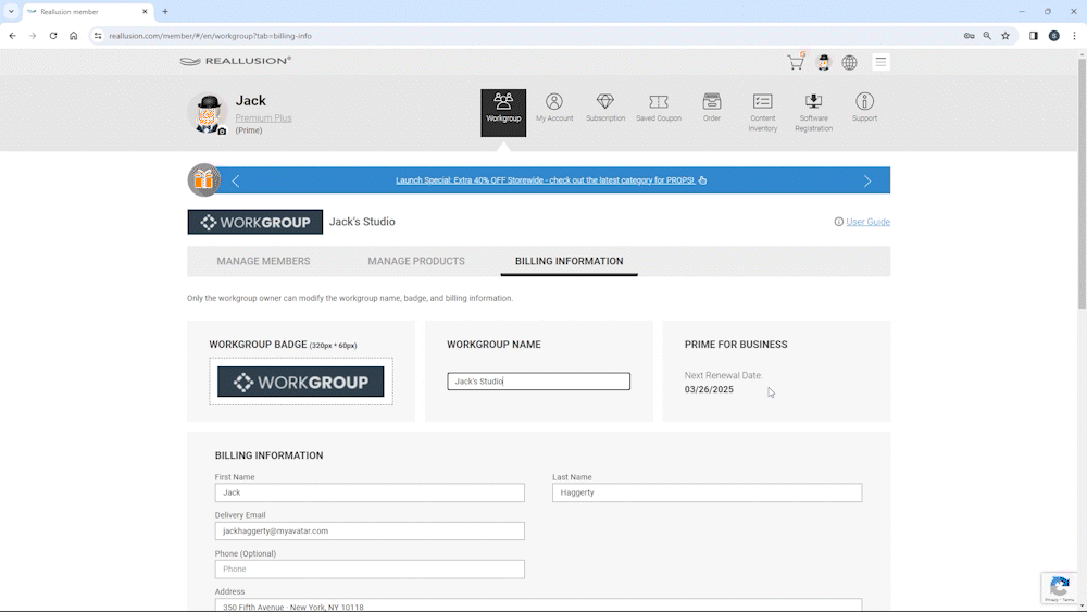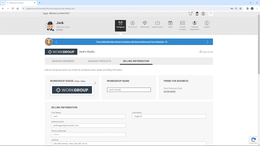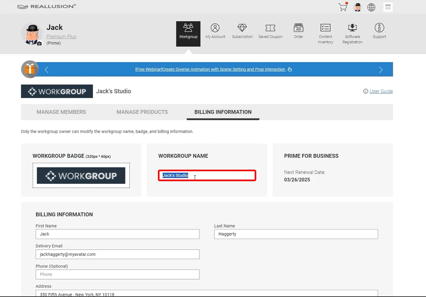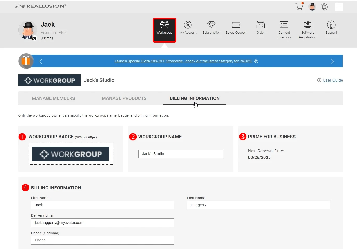 Designate a primary account as the Workgroup Owner, who will be responsible for purchasing assets and DA points with a credit card. Typically, the Reallusion Prime account holder also serves as the Workgroup Owner.